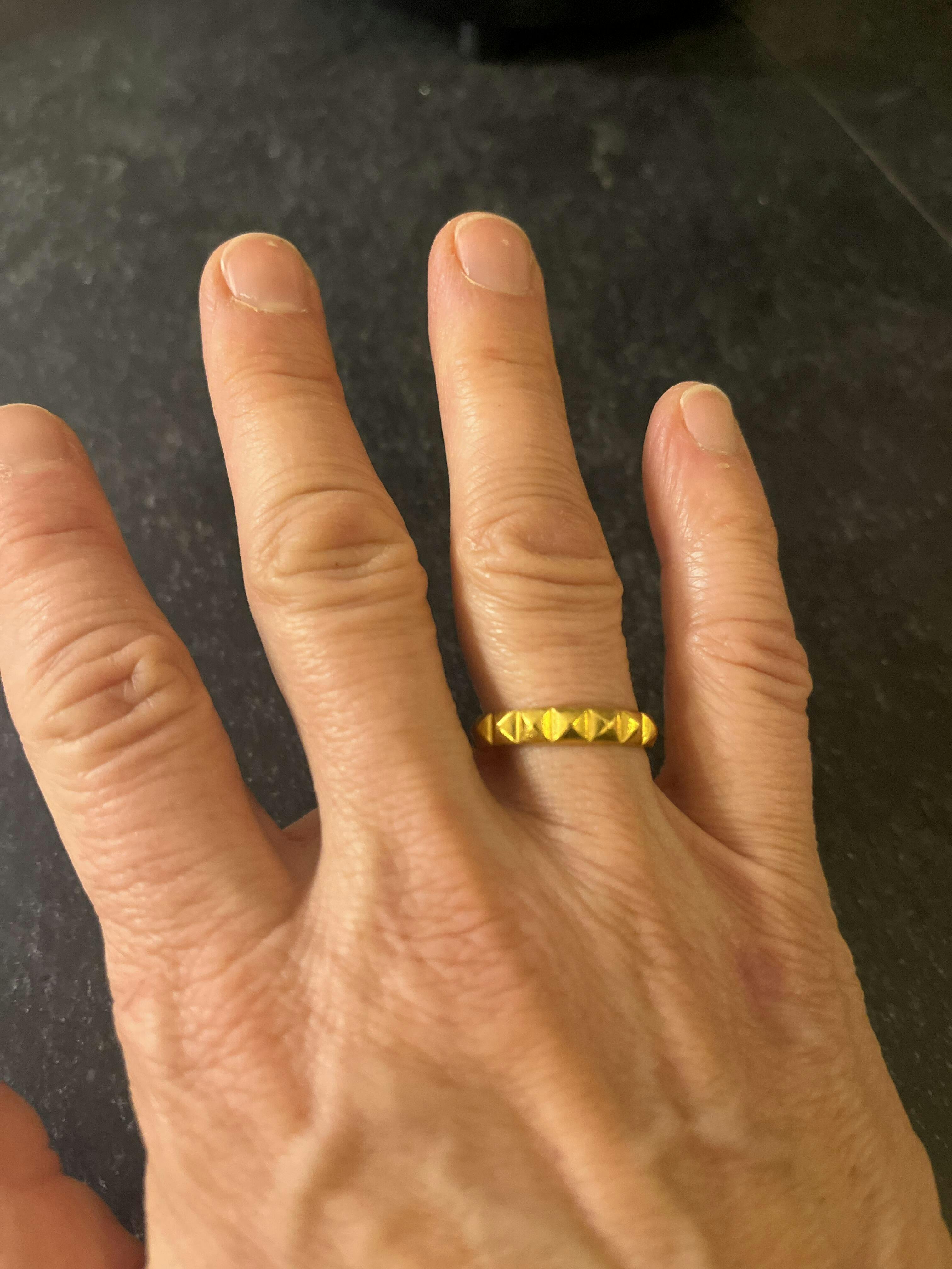Beautiful and substantial ring. More”yellow” than I was expecting but I suppose it is from the metal blend in the 18k. Plan on a “never take it off” ring but I also understand 18k is soft and may show wear easily and I am not a “soft hands” guy so plans may change. Already been looking at my next piece from Kuvera.