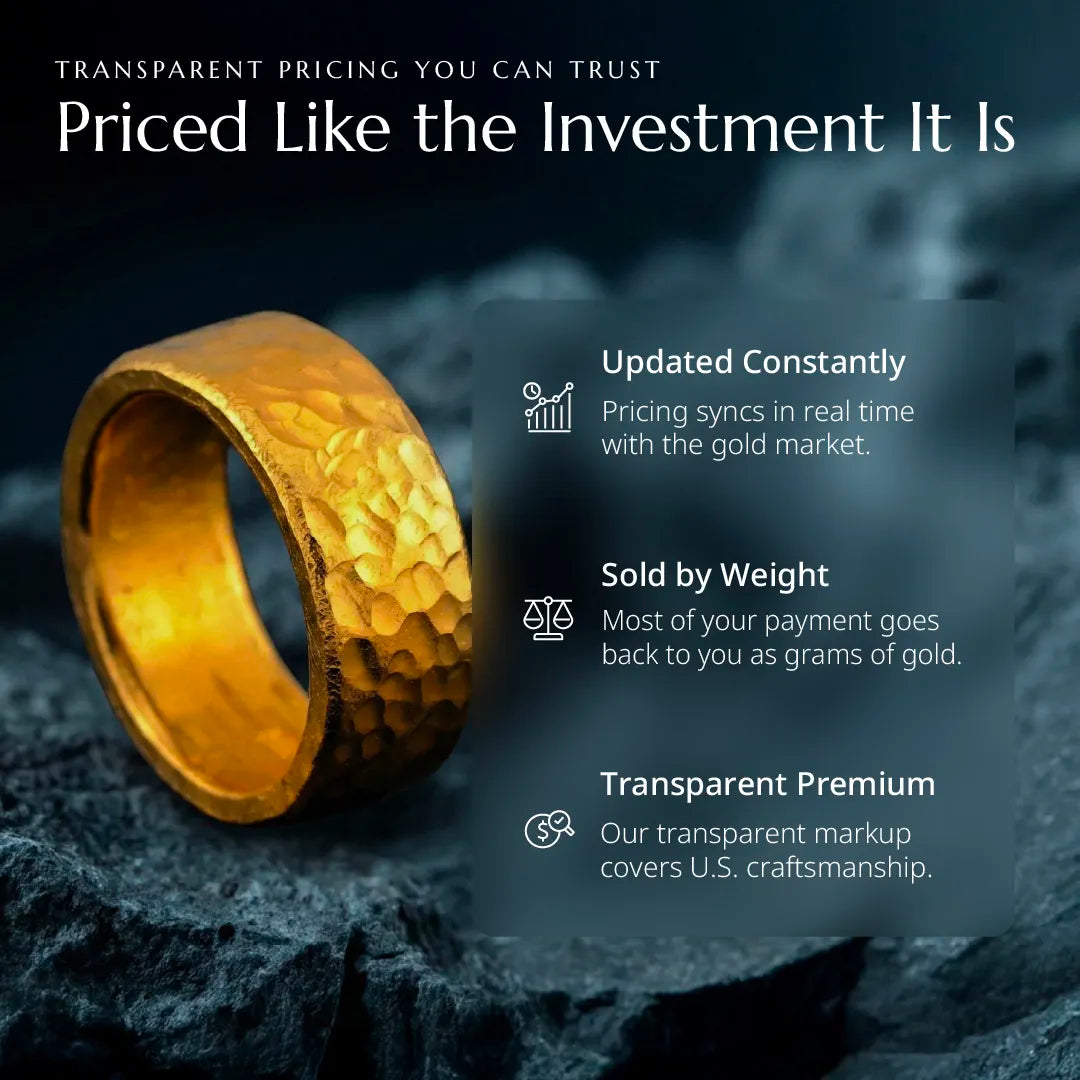 Our prices are tied to real-time gold market rates. When gold prices move, our prices move with them—up or down. This ensures you're always paying fair market value for the gold in your piece, not an arbitrary retail markup that never changes.
