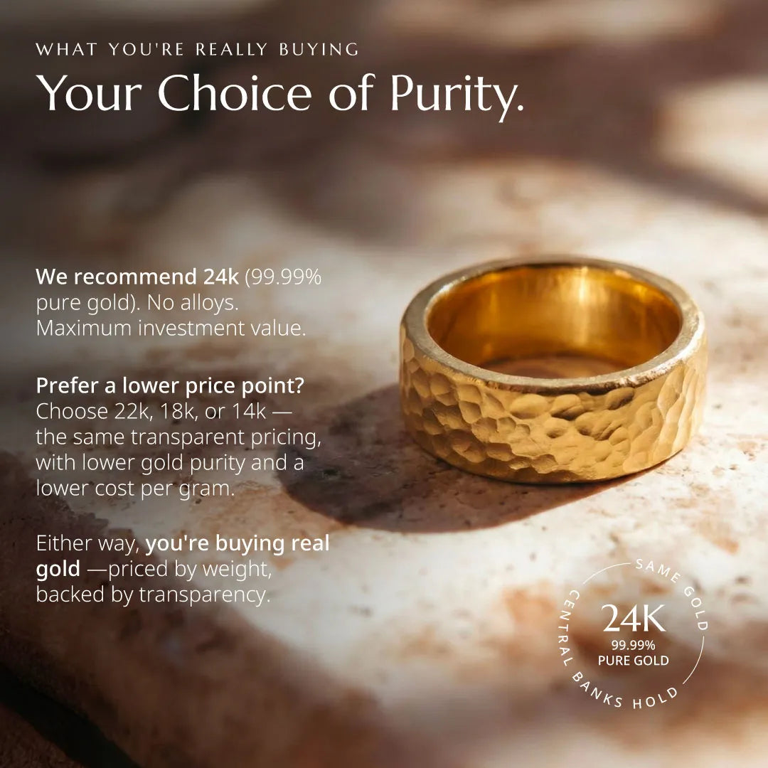 We break it down transparently on every product page. Approximately 70% of your purchase goes directly toward the pure gold content. The remaining ~30% (our KUVERA fee) covers craftsmanship, design, shipping, insurance, and operational costs. No hidden charges—just transparent pricing.